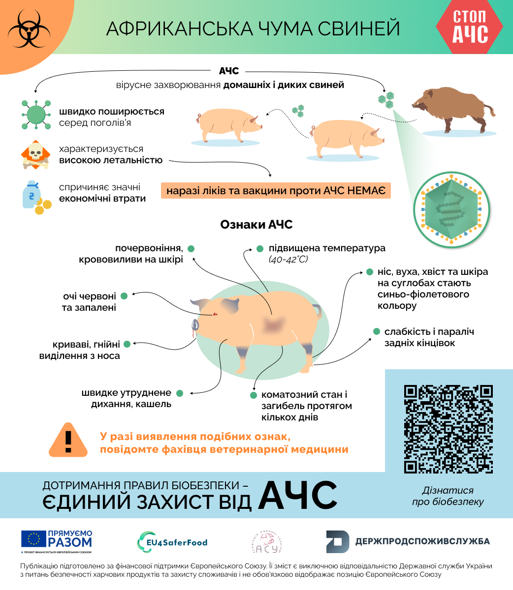 Детальніше про основні ознаки АЧС – в інфографіках, розроблених спільно з європейським проєктом EU4SaferFood та Асоціацією свинарів України.