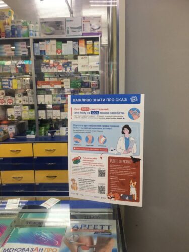 Так, в рамках проведення інформаційної кампанії щодо небезпеки сказу та основних заходів його профілактики на стендах та в громадських місцях поширюється пам’ятка «Важливо знати про сказ», яка створена спільно з Бюро ВООЗ в Україні та МОЗ.
