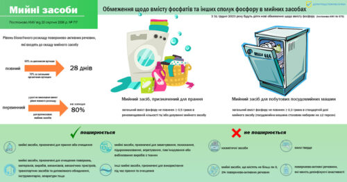 На виконання 5 пункту Плану заходів щодо державного ринкового нагляду та державного контролю продукції щодо відповідності мийних засобів вимогам Технічного регламенту мийних, затверджено розпорядженням Кабінету Міністрів України від 2 серпня 2022 року № 678-р, інформуємо суб’єктів господарювання у частині встановлення обмеження щодо вмісту фосфору в мийних засобах, що використовуються відповідно до ПКМ від 02.06.2021 р. № 575: