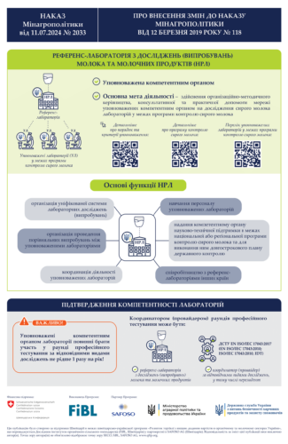 Також наказом (змінами) затверджено специфічні функції національної референс-лабораторії, основною метою якої є здійснення організаційно-методичного керівництва, консультативної та практичної допомоги мережі уповноважених компетентним органом на дослідження сирого молока лабораторій в межах програми контролю сирого молока. Це віхова подія, що посилює інституційну спроможність ризик-орієнтованої системи контролю в молочному секторі та його готовність для інтеграції з ринком молока Європейського Союзу.