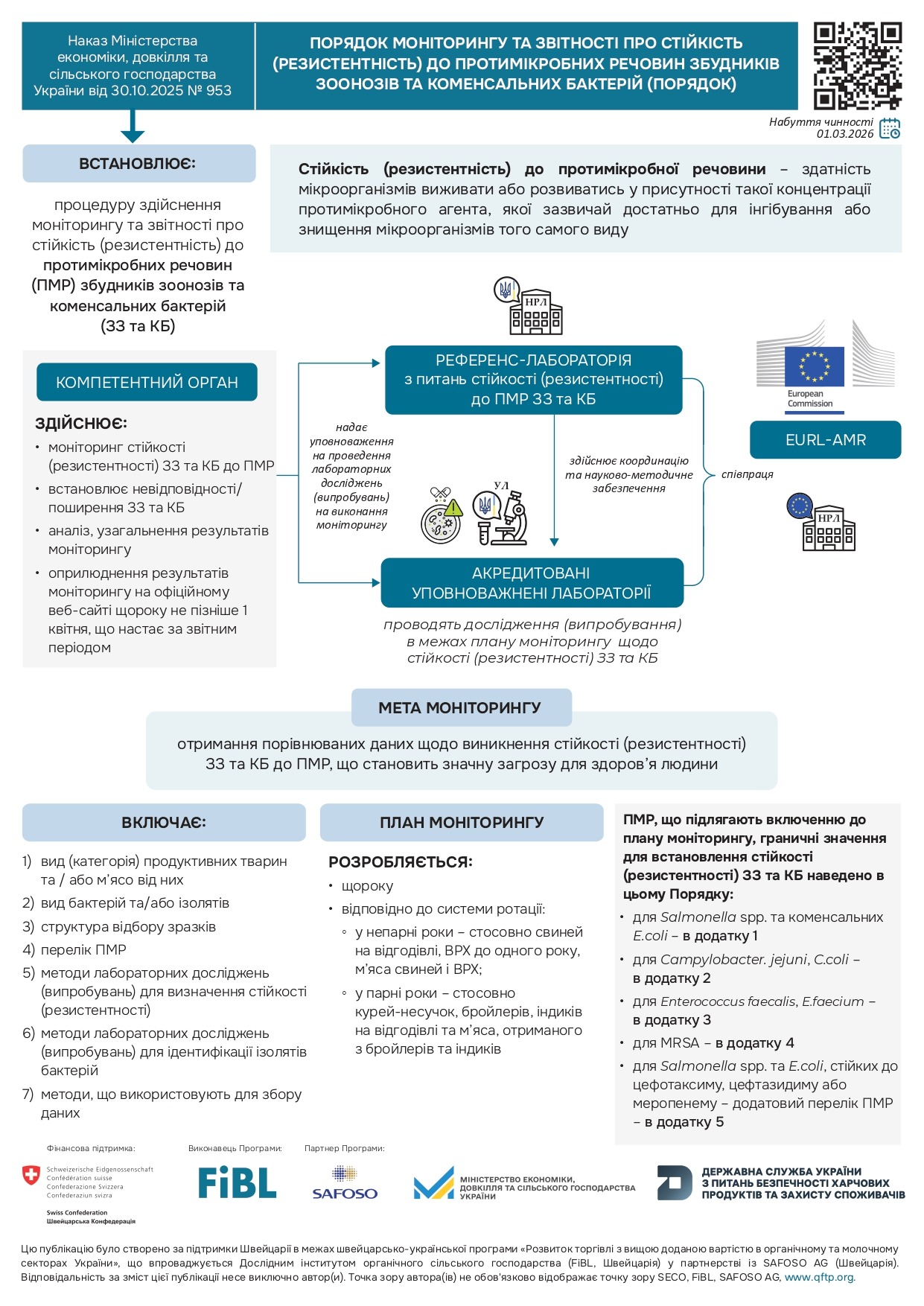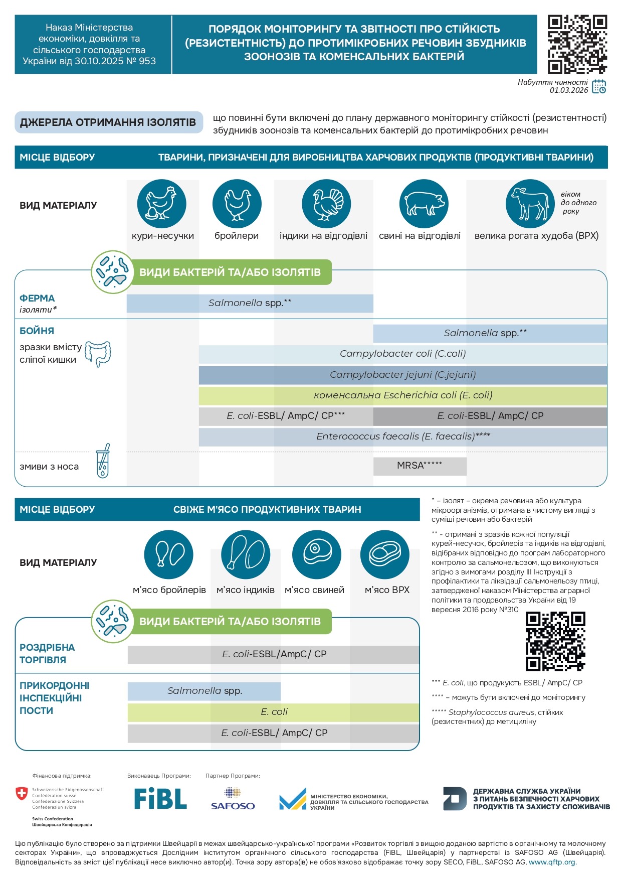 За підтримки Швейцарії у межах швейцарсько-української програми «Розвиток торгівлі з вищою доданою вартістю в органічному та молочному секторах України» (Quality FOOD Trade Program), що впроваджується Дослідним інститутом органічного сільського господарства (FiBL,Швейцарія) у партнерстві з SAFOSO AG (Швейцарія), Міністерством економіки, довкілля та сільського господарства України та Держпродспоживслужби створено інфографіки, в яких висвітлено основні положення порядку моніторингу та звітності про стійкість (резистентність) до протимікробних речовин збудників зоонозів та коменсальних бактерій.