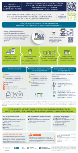 • встановлюються вимоги щодо проведення лабораторних досліджень (випробувань) молока сирого та виготовлених із нього молочних продуктів (крім продукції промислового виробництва), що вводяться в обіг операторами ринку молока та молочних продуктів, у тому числі дрібнотоварними виробниками, кінцевому споживачу через агропродовольчі ринки.