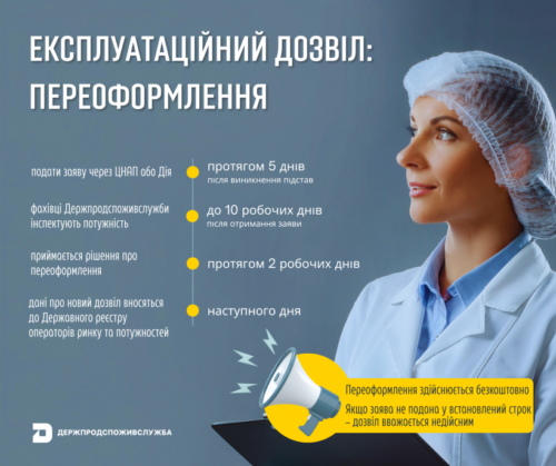протягом 5 робочих днів подати заяву про переоформлення експлуатаційного дозволу через центр надання адміністративних послуг або через Дія до територіального органу Держпродспоживслужби;