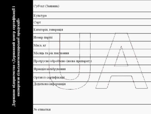 Лівий край лицьового боку етикетки обкантовано чорною смугою завширшки 30 міліметрів з написом «Державне підприємство «Державний центр сертифікації і експертизи сільськогосподарської продукції».