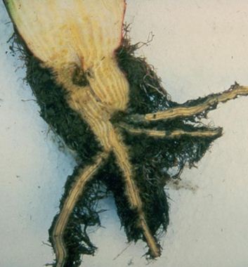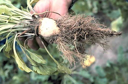 Коренеплоди дрібні, недорозвинені, з великою кількістю дрібних, переплетених між собою корінців, вони відстають у рості, схильні до загнивання. При поперечному розрізі коренеплоду добре помітне побуріння судинних пучків.