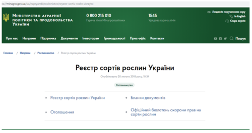 2. Після встановлення наявності сорту (гібриду) в Реєстрі, для ознайомлення з його характеристиками, відвідайте офіційний веб-сайт власника або підтримувача (фізичної або юридичної особи, яка впродовж чинності, визначеного Законом України “Про охорону прав на сорти рослин”, строку майнового права інтелектуальної власності на поширення сорту рослин, яке засвідчене свідоцтвом про державну реєстрацію сорту рослин, забезпечує збереженість сорту у процесі його господарського обороту шляхом підтримання ознак, породжених певним генотипом або комбінацією генотипів відповідно до прояву, що був зафіксований при державній реєстрації).