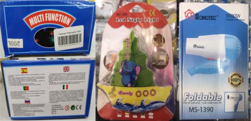 – новорічна гірлянда: Multifunction, 200 ламп; – нічник «LedNightLight», NO.:208, 220-240V, 50/60Hz, MadeinChina; – фен ТМ «DOMOTEC», модель MS-1390, art. 3063, 1000W.